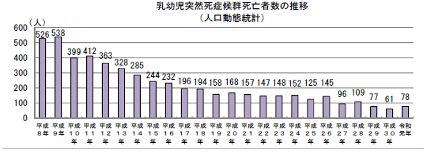 厚生労働省のデータによると、令和元年にSIDSで死亡した乳幼児は78名だといわれています。