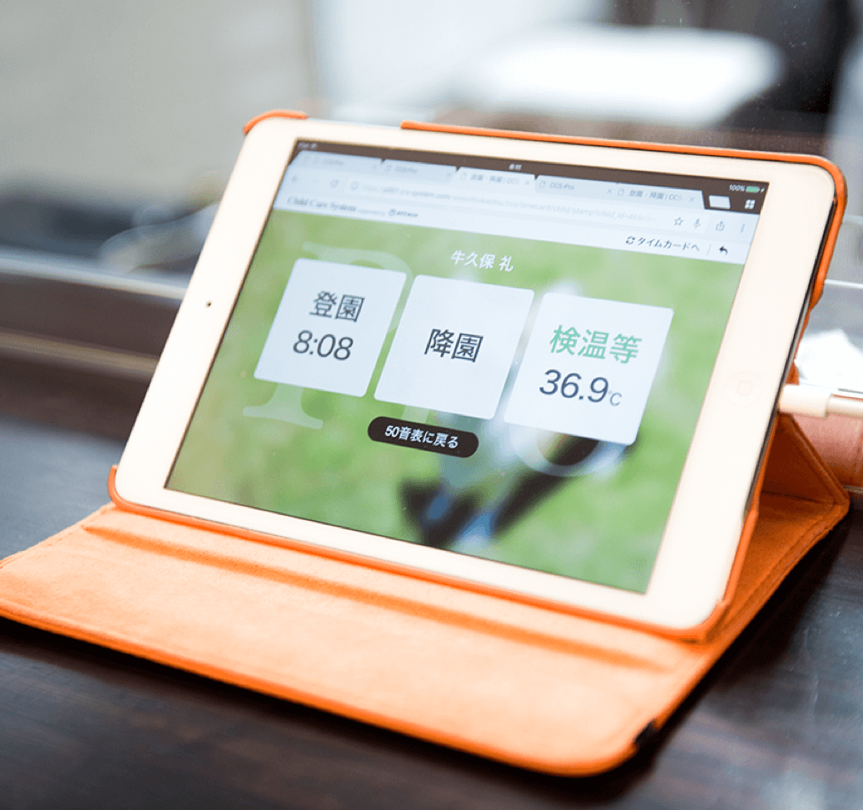 「登降園管理システム」は、保育士が今まで手書きで行っていた園児の登園管理などを行わずに済むため、結果業務の負担が減らすことに役立っています。